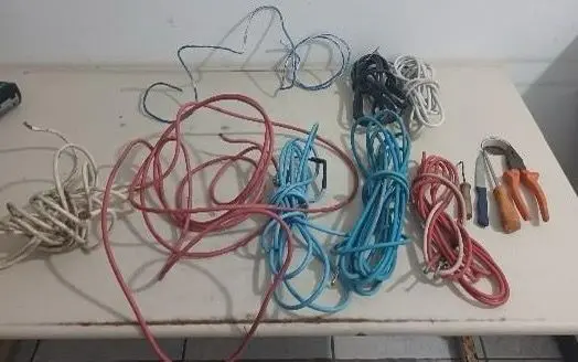 A PM foi acionada por volta das 20h30, para averiguar os suspeitos que estariam furtando fios do poste em frente à escola. No local, os policiais encontraram os suspeitos que foram abordados em uma rua próxima da unidade de ensino, eles estavam a cerca de 200 metros de distância.