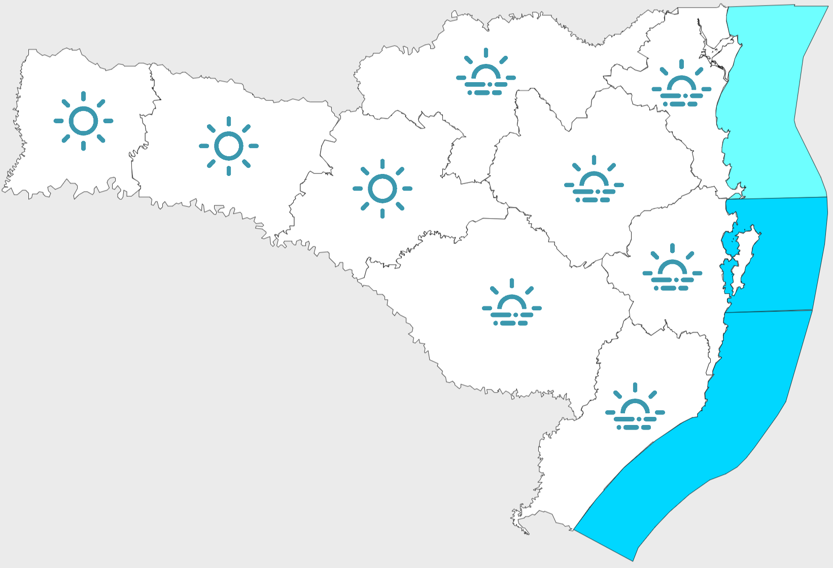 O domingo (09) inicia novamente com formação de nuvens, principalmente ao longo do litoral, Vale do Itajaí e Serra. Entretanto, ao longo da manhã eles tendem a se dissipar, dando lugar ao predomínio de sol em todas as regiões. Os ventos de direção norte devem variar de fraca a moderada intensidade com rajadas entre 40 e 60 km/h ao longo do período no Grande Oeste e nas áreas serranas do Planalto Sul, Litoral Sul e da Grande Florianópolis com risco baixo de ocorrências associadas aos ventos . As temperaturas no amanhecer variam entre 4°C e 12°C nos pontos mais altos dos planaltos, Meio-Oeste e Grande Florianópolis Serrana e marcam entre 12 e 20°C nas demais regiões. À tarde, as máximas oscilaram entre 20 e 26°C nos planaltos, Grd. Florianópolis, Vale do Itajaí e Litoral Norte, 21 a 28°C no Meio-Oeste e de 25°C a 31°C no Extremo Oeste, Oeste e Litoral Sul.