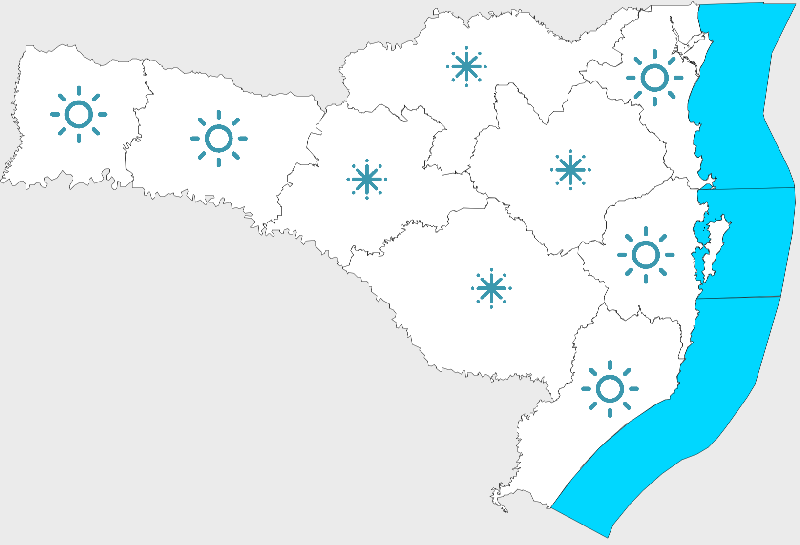 Na quinta-feira (15), inicia com formação de nuvens pelo estado e com ocorrência nas áreas entre os planaltos e na Grande Florianópolis Serrana. Ao longo do período, um sistema de alta pressão segue favorecendo o predomínio de sol em todas as regiões. Como a massa de ar frio começa a perder intensidade, no amanhecer as temperaturas serão um pouco mais altas em comparação aos dias anteriores, registrando entre 2 e 9°C no Meio-Oeste, planaltos, no Alto Vale, na Grande Florianópolis Serrana e nas áreas serranas do Litoral Sul, nas demais áreas com variação entre 9 e 17°C. À tarde, as máximas marcaram entre 23 e 31°C no Grande Oeste e no Litoral Sul e oscilaram entre 19 e 25°C no restante de Santa Catarina.