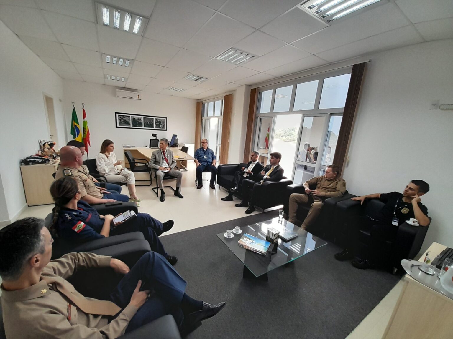 O encontro, na sede da SSP-SC, foi presidido pelo secretário de Segurança Pública de SC designado, coronel Flávio Graff, e contou com a presença do comandante-geral da Polícia Militar, coronel Aurélio Pelozato; do delegado-geral da Polícia Civil, Ulisses Gabriel; do comandante-geral do Corpo de Bombeiros Militar, coronel Fabiano Bastos e da perita-geral da Polícia Científica, Andressa Boer Fronza, além de integrantes das áreas de inteligência e assessores chefes.