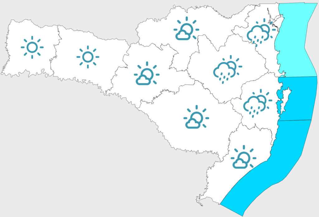 As temperaturas máximas variam entre 23 e 32°C no Oeste e Extremo Oeste e marcam entre 18 a 26°C no restante do estado com valores pontualmente menores nas áreas serranas. Mar pouco agitado entre o Litoral Sul e a Grande Florianópolis, com ondas de sudeste, alturas entre 1,0 e 1,5m e picos de até 2,0m em alto mar e mar calmo no Litoral Norte, com ondas entre 0,5 e 1,0m e picos de até 1,5m em alto mar.