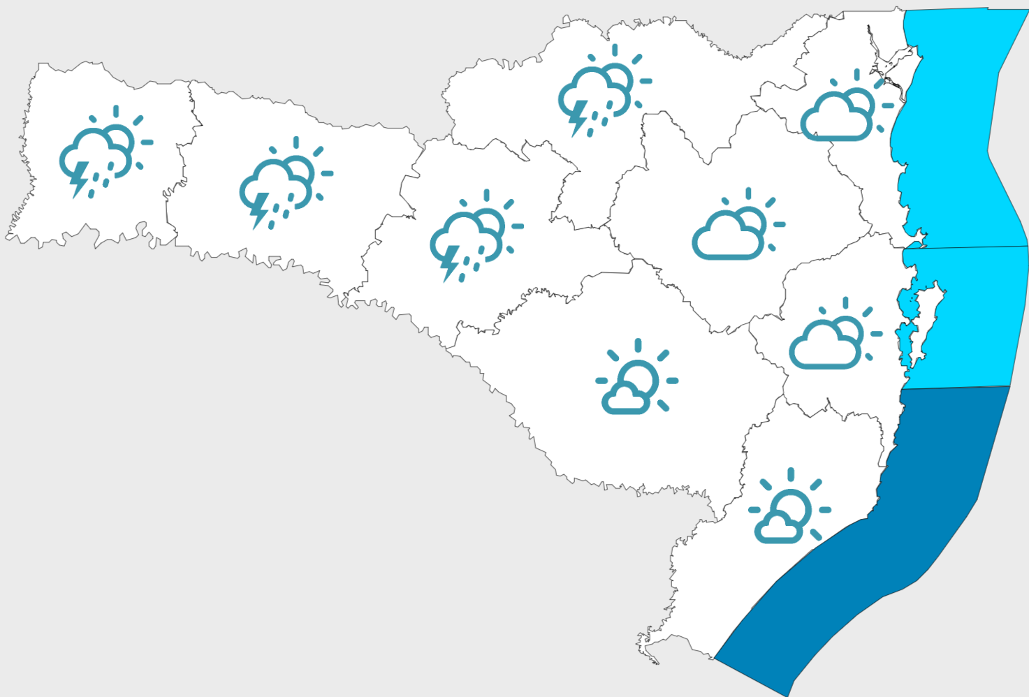A segunda-feira (28) terá predomínio de sol e variação de nuvens na maioria das regiões. Entretanto, a influência de uma área de baixa pressão favorecendo uma ocorrência de temporais muito isoladas durante a tarde entre o Grande Oeste e o Planalto Norte com risco baixo para ocorrências associadas. Na Serra, Vale do Itajaí, Gr. Florianópolis e Litoral Norte, apresentam maior quantidade de nuvens e condições para chuviscos no início e final do dia.