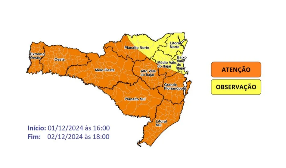 A Defesa Civil de Santa Catarina emitiu um alerta para a possibilidade de temporais severos em todo o estado entre este domingo (1) e segunda-feira (2). A passagem de uma frente fria deve provocar instabilidades atmosféricas, com risco de chuvas intensas, ventos fortes, raios e até queda de granizo em algumas regiões.