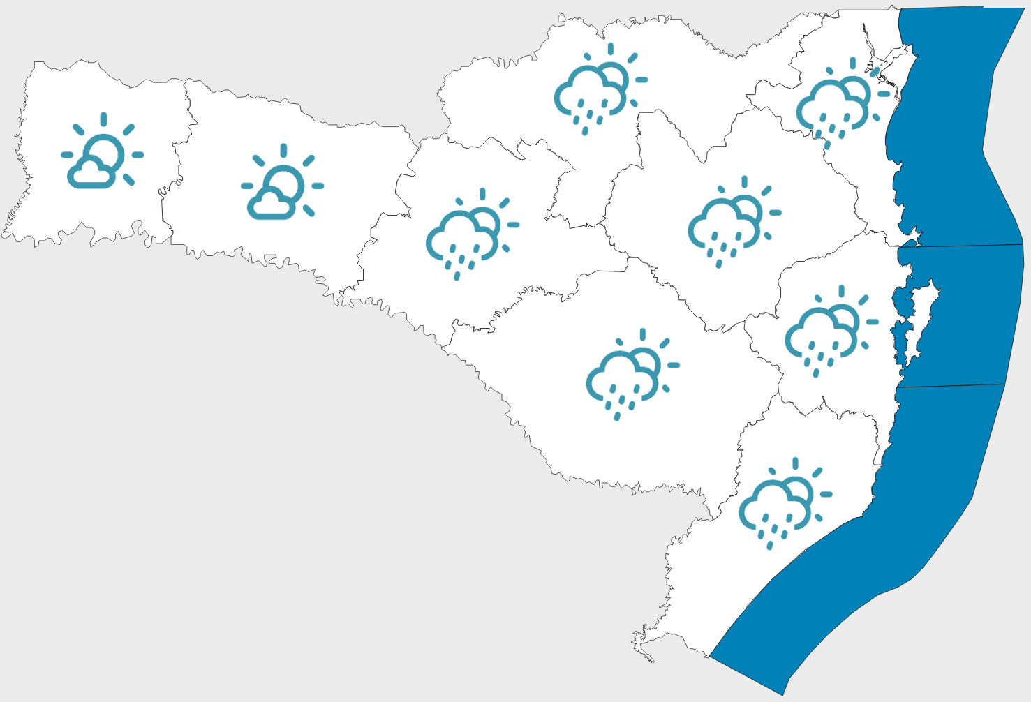 Na segunda-feira (16) o tempo se mantém com a presença de bastante nebulosidade e condições para chuvas isoladas e passageiras entre os planaltos e o litoral. Isso ocorre devido ao deslocamento de umidade, provocado pela atuação do ciclone no mar, mas estas condições não trazem riscos para ocorrências associadas às condições de tempo.