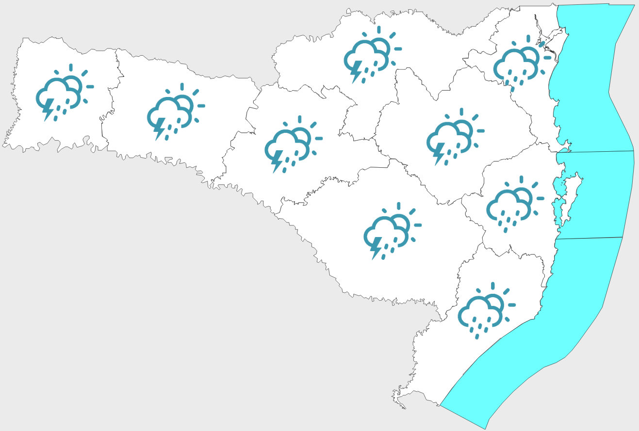 Nas áreas da faixa leste catarinense, o dia será marcado por variação de nebulosidade e condições para pancadas de chuva rápidas e passageiras ao longo do dia, intercaladas por aberturas de sol. O risco é baixo a moderado para ocorrências associadas às condições de tempo. À tarde, as temperaturas máximas ficam em torno de 31°C no Grande Oeste e variam entre 20°C e 27°C nas demais regiões.