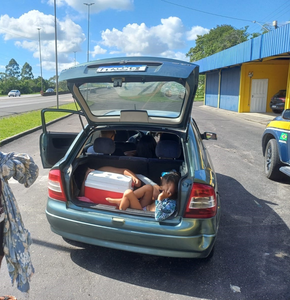 O motorista, morador de Palhoça, disse que estava levando a esposa e cinco filhos para passar o dia em uma praia de Imbituba. Como não havia espaço para todos, as duas crianças de 08 e 11 anos foram parar no porta-malas, disputando espaço com sacolas e uma caixa térmica.