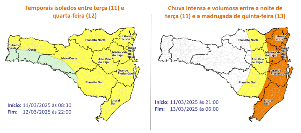 A chuva ganha força e passa a ocorrer de maneira persistente, em alguns momentos, no decorrer da noite desta terça (11) e ao longo da quarta-feira (12), conforme as instabilidades avançam em direção ao litoral. Com isso, entre a Grande Florianópolis, Litoral Sul, Litoral Norte e parte do Vale do Itajaí, o risco é alto para alagamentos, enxurradas e deslizamentos. Os volumes de chuva previstos variam, no geral, entre 100 mm e 150 mm, com pontuais na casa dos 200 mm.