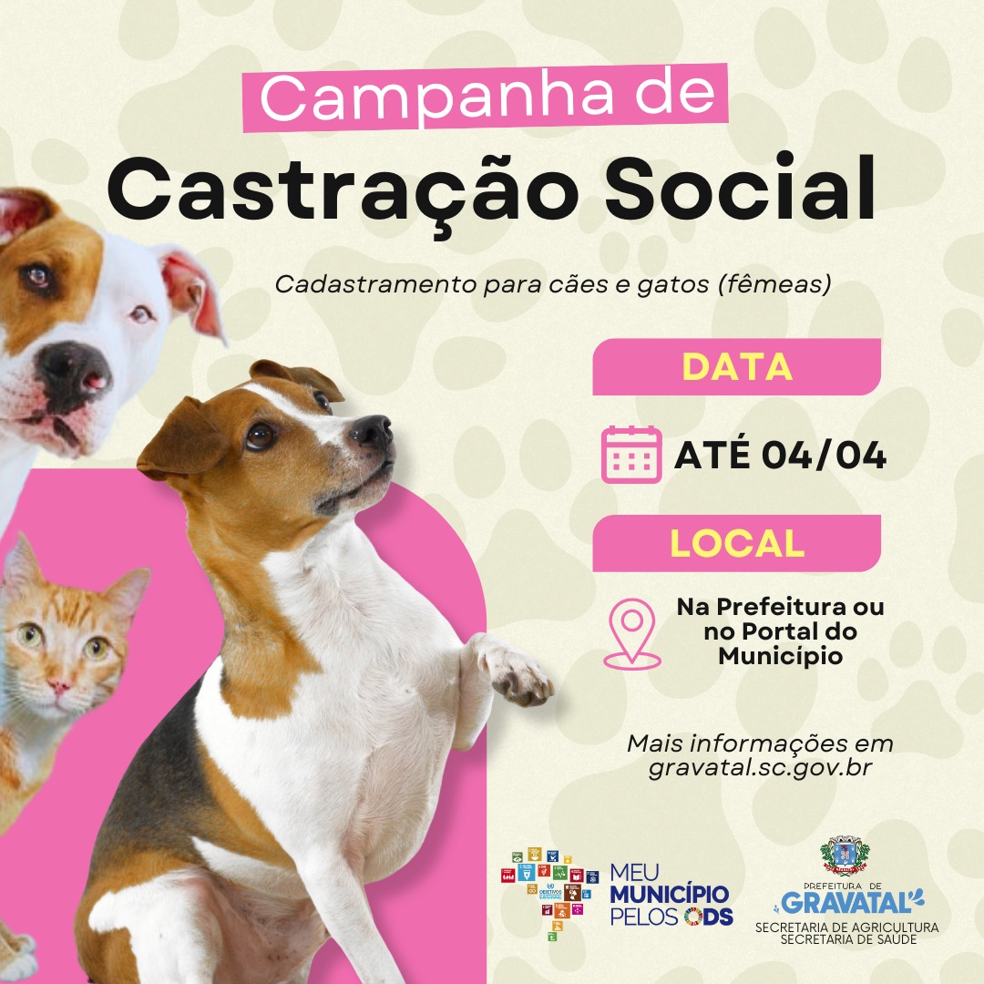 A Prefeitura de Gravatal, por meio das Secretarias de Agricultura e Saúde, está promovendo uma nova edição da Campanha de Castração Social. No sábado, 29 de março, será realizado um mutirão para castração de cães e gatos (fêmeas) na sede da Agricultura, no bairro Caeté. Animais já cadastrados serão convocados.
