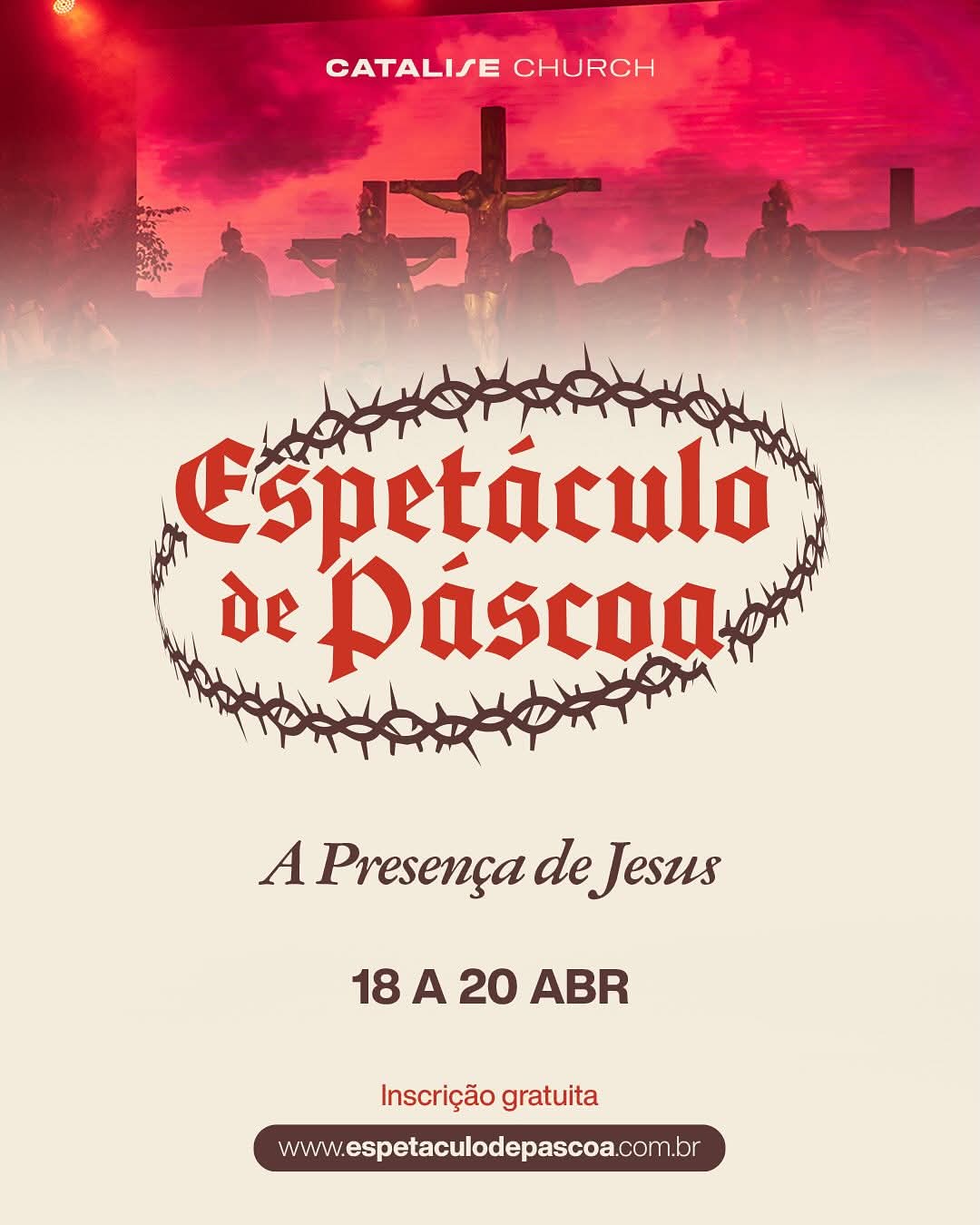 Depois de anos emocionando plateias, o espetáculo de Páscoa da Catalise Church volta aos palcos com uma superprodução que promete impactar corações, tocar almas e renovar a fé de todos os presentes. Imagine um lugar comum. Agora imagine esse lugar sendo invadido pela presença de Jesus.