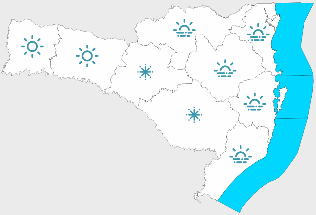 O sistema de alta pressão/massa de ar seco mantém o tempo estável e com presença de sol em todo estado nesta quinta-feira (10). No Litoral e áreas próximas o dia começa com maior nebulosidade, com presença de nevoeiros e com chance de chuviscos nas primeiras horas da manhã no Litoral Norte. Não há risco para ocorrências meteorológicas.