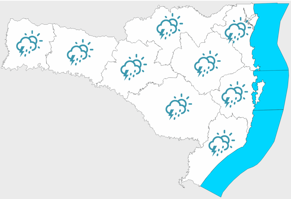 Amanhã o tempo muda completamente, domingo (21) e a segunda-feira (22) são esperadas intensas instabilidades associadas a temporais com raios, chuva intensa, vendavais e queda de granizo em todas as regiões de Santa Catarina. Nas áreas em vermelho do mapa o risco é muito alto para ocorrências relacionadas a destelhamentos, queda de árvores e postes de energia, alagamentos e enxurradas pontuais. Nas áreas em laranja o risco é alto, e é moderado nas áreas em amarelo.
