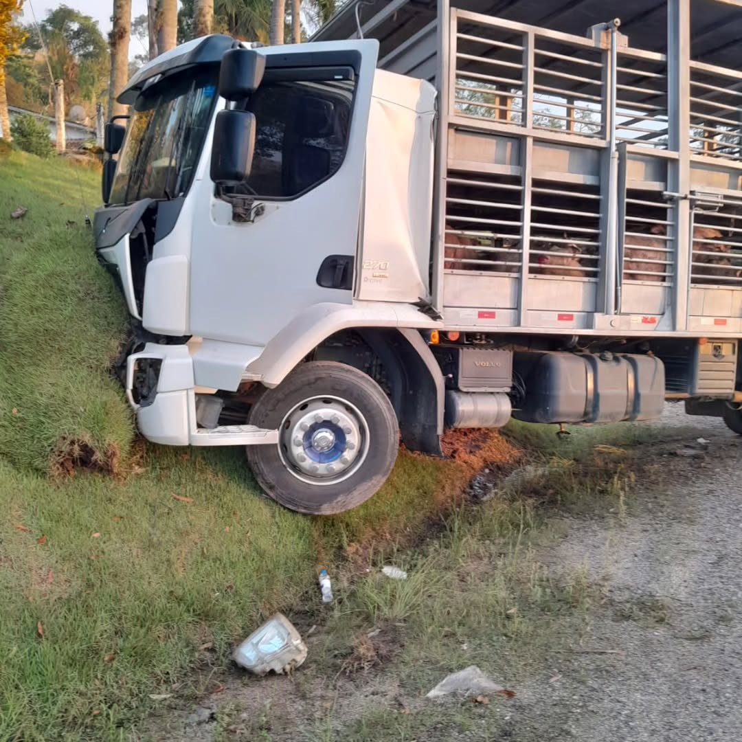 Um caminhão que transportava suínos saiu da pista nesta manhã desta segunda-feira (29), e acabou colidiu em um barranco às margens da SC-370, próximo à madeireira Pickler, em Braço do Norte.