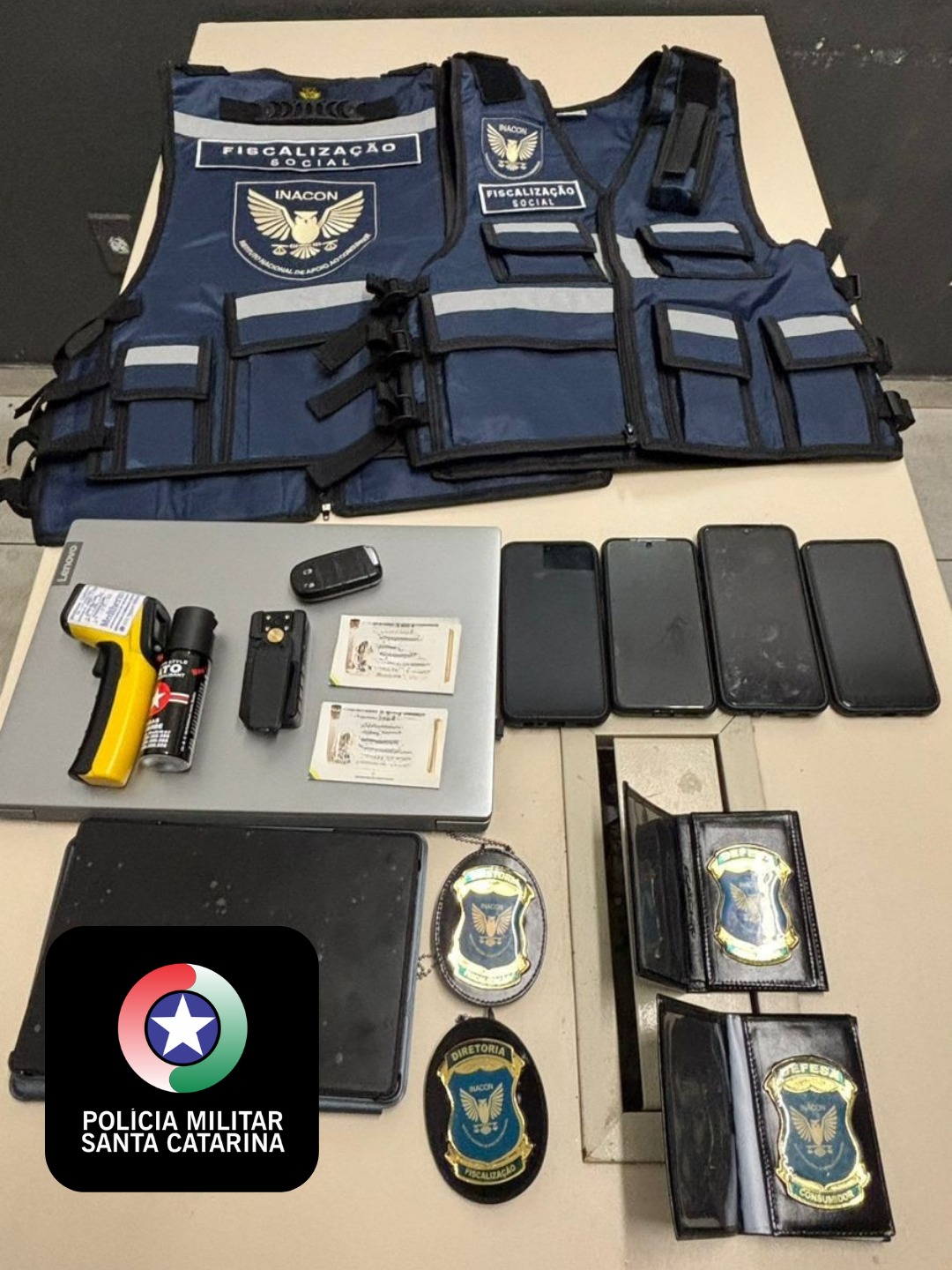Durante a abordagem, os policiais encontraram os dois indivíduos, um deles trajava colete com inscrições de “fiscalização”. Em buscas pessoal e veicular, foram localizados diversos itens que simulavam a função de agentes públicos, como distintivos, carteiras funcionais, câmera corporal, spray de pimenta, computadores, celulares, um tablet e até um equipamento de verificação de combustíveis.