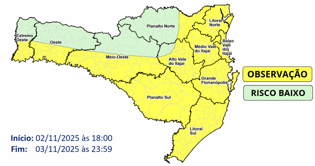 A Defesa Civil -SC emitiu um aviso meteorológico nesta manhã alertando que entre este domingo (02/11) e a segunda-feira (03/11), áreas de instabilidade associadas a uma baixa pressão mantém a condição para a formação de temporais isolados por todas as regiões do estado. Estes temporais podem ser pontualmente intensos, acompanhados por raios, rajadas de vento e eventual queda de granizo, trazendo risco moderado nas áreas em amarelo e baixo nas áreas em verde para ocorrências associadas a alagamentos, queda de galhos, destelhamentos e danos na rede elétrica.