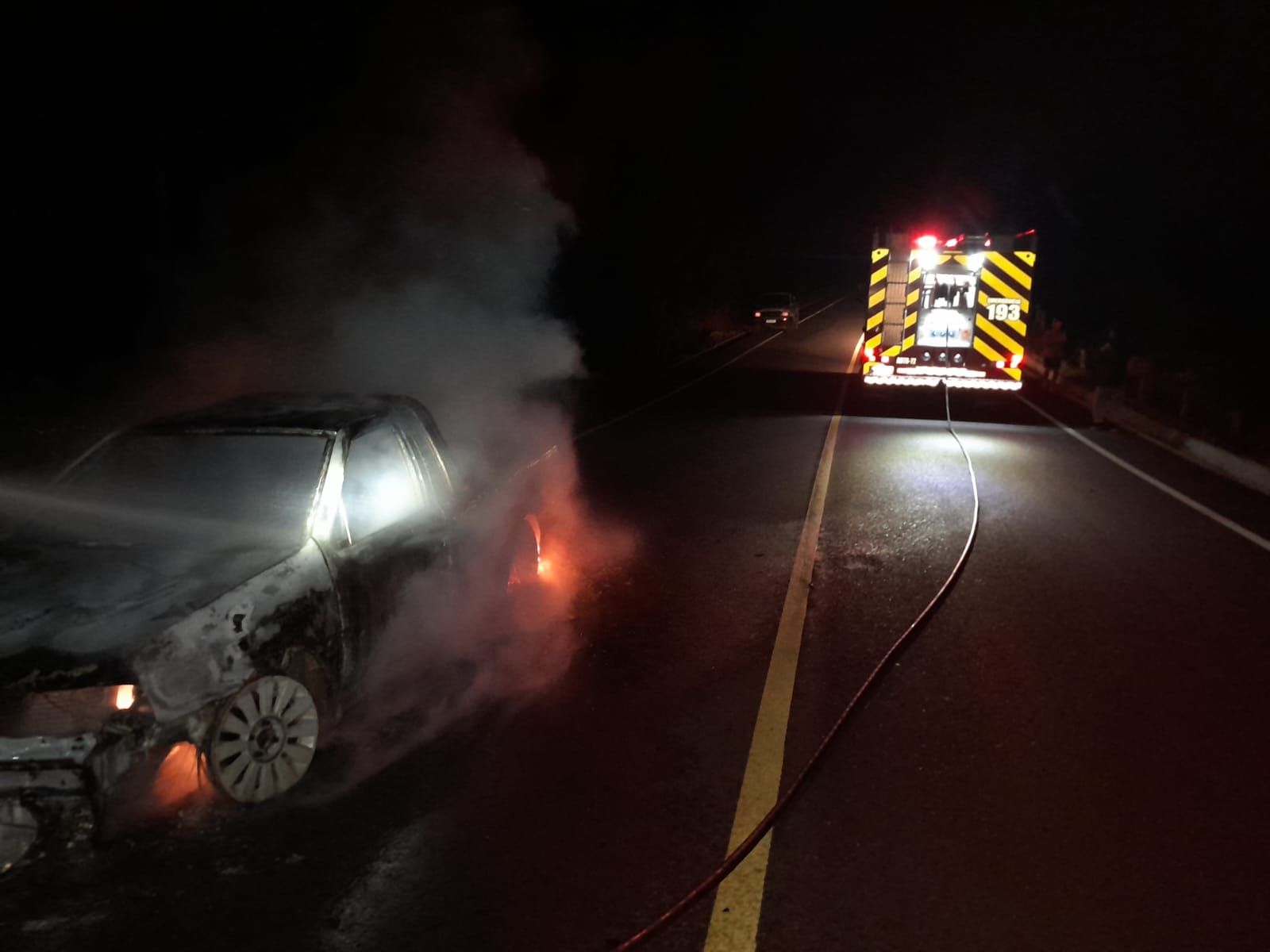 Ao chegar no local, os socorristas constataram se tratar de um automóvel utilitário modelo Saveiro, que já se encontrava totalmente em chamas. Em razão de o incêndio ocorrer em uma rodovia situada em uma área de serra com curvas acentuada, foi realizada a devida segurança junto com o combate.