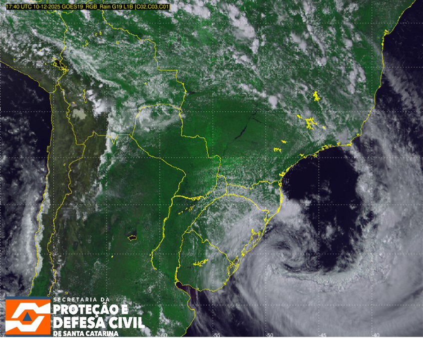 A atuação do ciclone, que se formou entre os estados de Santa Catarina e do Rio Grande do Sul, trouxe chuvas intensas e rajadas de vento em diversas regiões do estado catarinense esta semana, principalmente entre a terça e a quarta-feira (9 e 10). O sistema pode ser visualizado na imagem do satélite abaixo (Figura 1), pelas áreas esbranquiçadas em formato semelhante a um espiral.