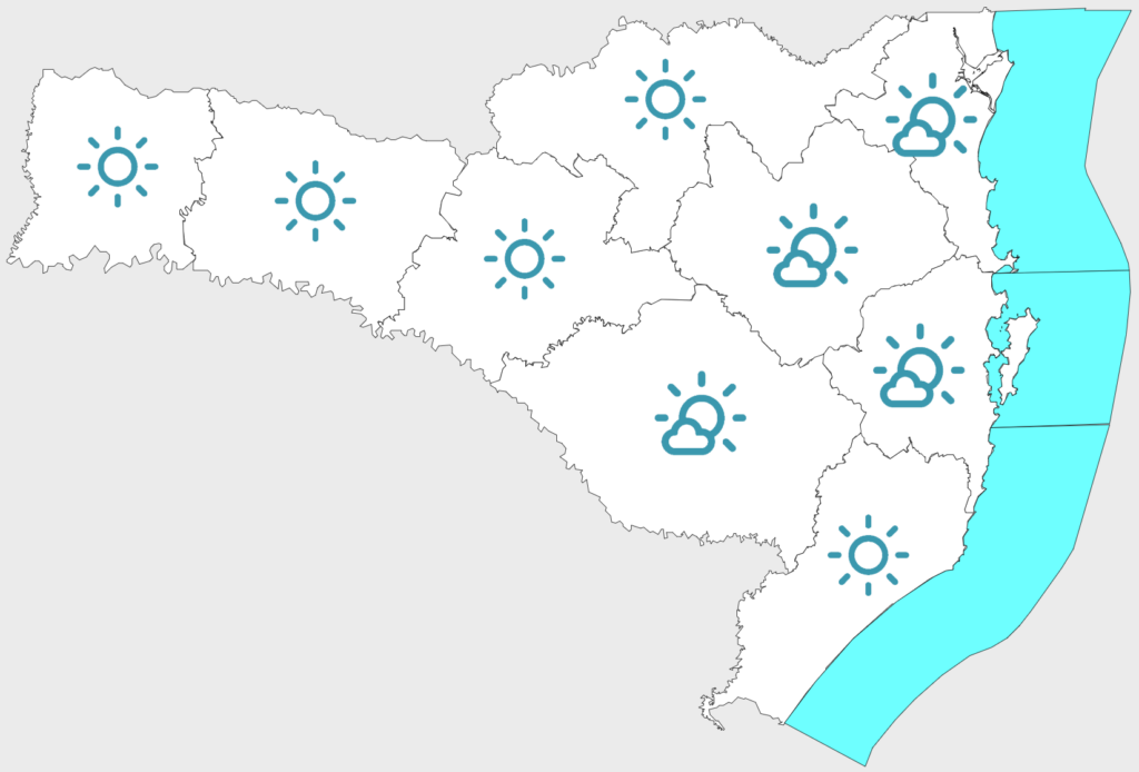 As mínimas variam de 6°C a 15°C nos Planaltos e Meio-Oeste e nas demais regiões, os termômetros ficam entre 15 e 20°C. À tarde esquenta, com marcas próximas dos 30/32°C no Litoral Sul e Oeste, 27°C a 30°C na Grd. Florianópolis Litorânea, Vale do Itajaí e Litoral Norte.
