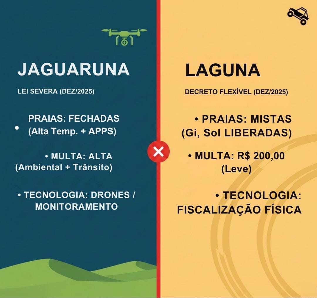Enquanto Jaguaruna cega suas dunas e áreas de banho com fiscalização tecnológica e proibições severas, Laguna oficializa decretos que mantêm praias como “estacionamentos” e fixam multas consideradas irrisórias.