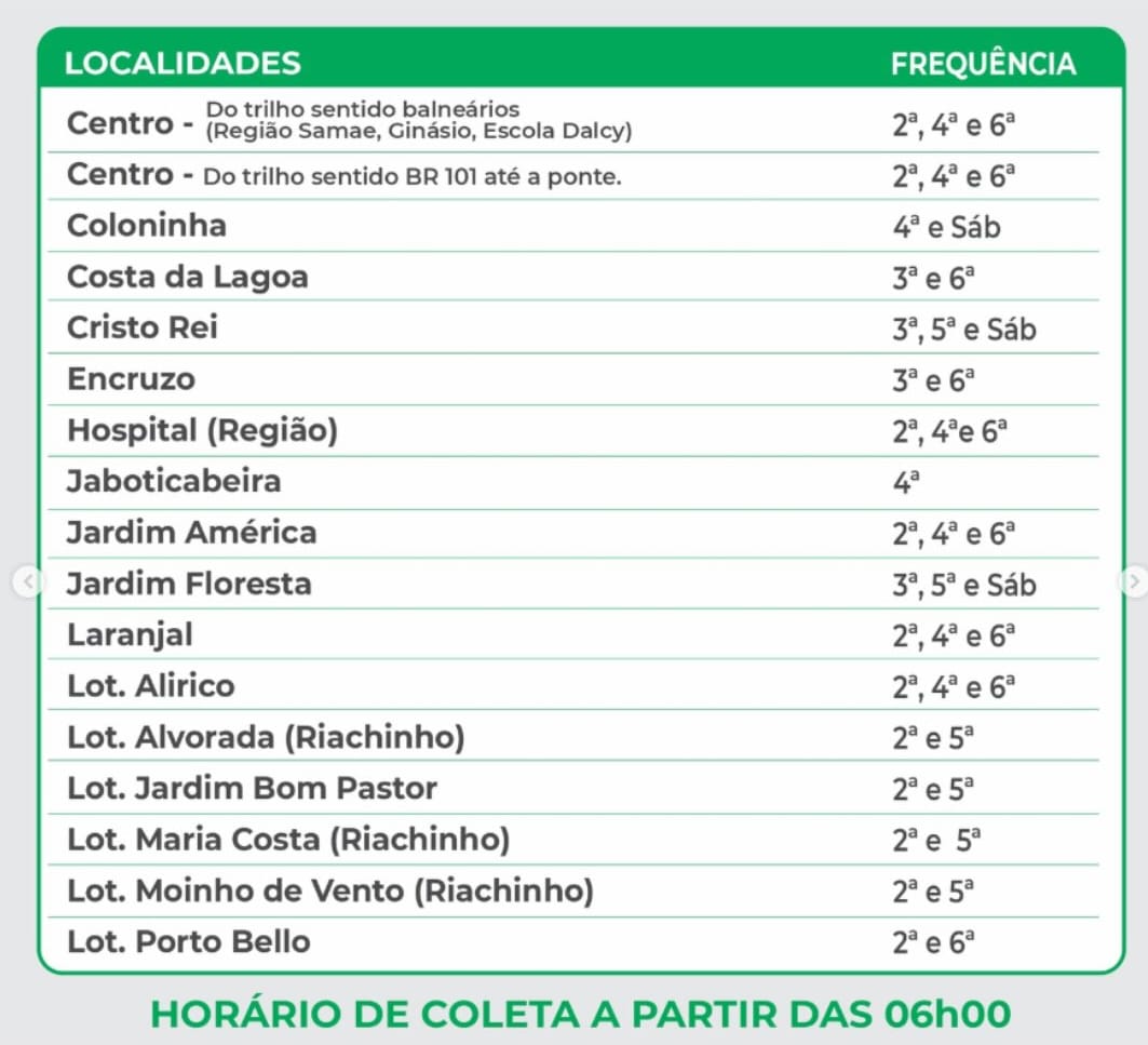 A Prefeitura de Jaguaruna informa aos moradores e veranistas sobre a atualização do itinerário da Coleta de Lixo para a alta temporada 2026.