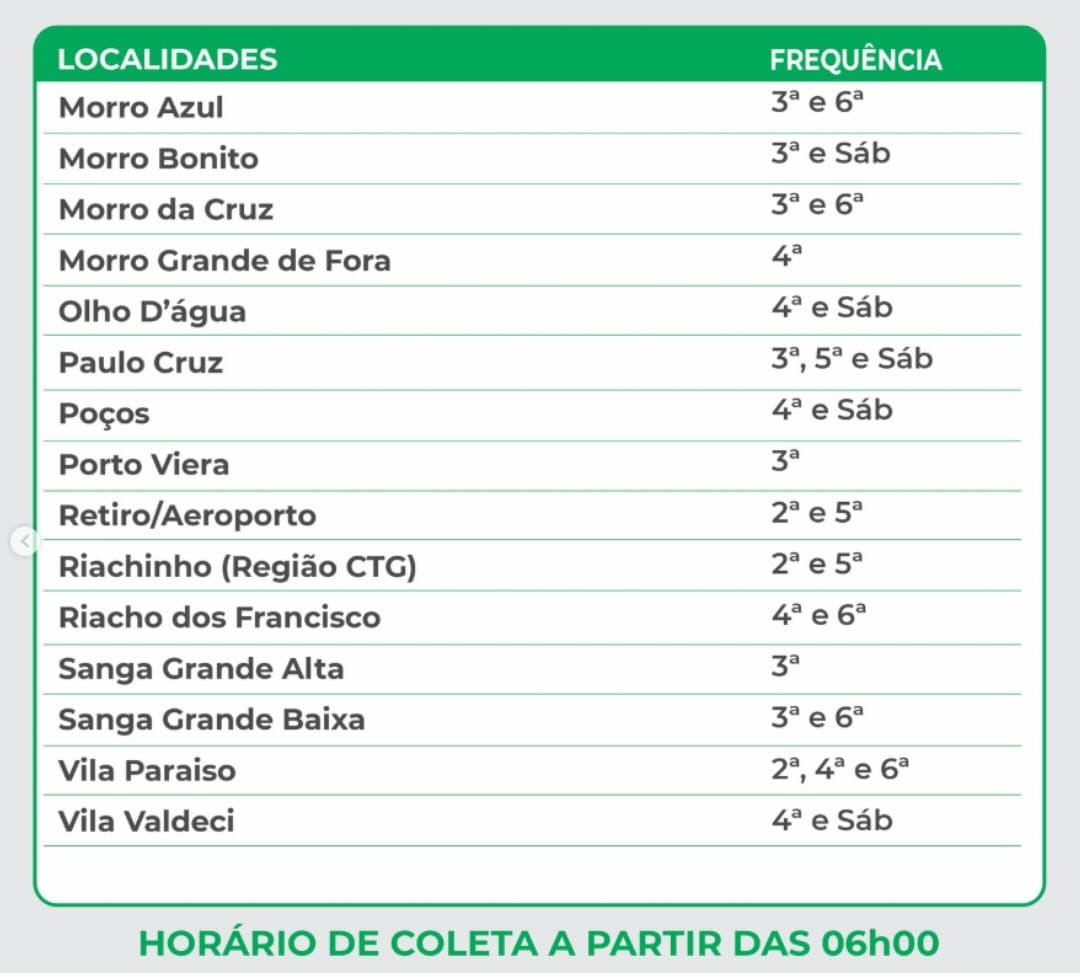 A empresa Racli Limpeza Urbana, concessionária do Governo Municipal, é responsável pela coleta de lixo na cidade. Para garantir um ambiente limpo e organizado, a prefeitura recomenda que todos verifiquem o itinerário atualizado e realizem o descarte correto de seus resíduos.