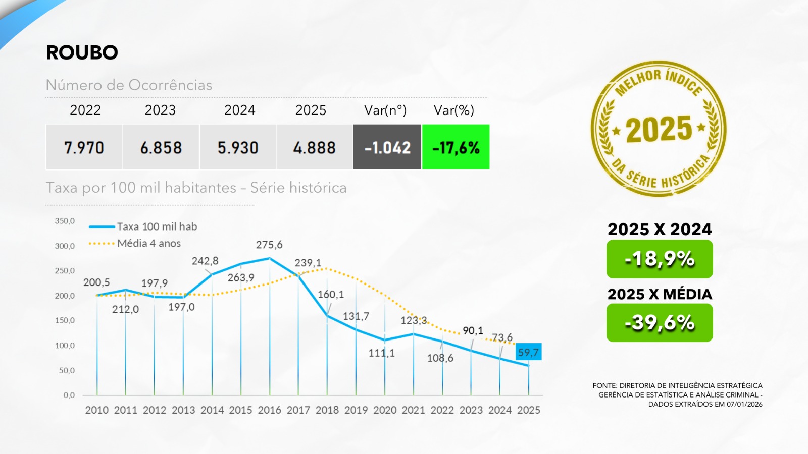 O cenário da segurança pública em Santa Catarina, em 2025, conquistou resultados inéditos, que superam toda a série histórica de quase duas décadas. Graças ao desempenho excepcional das forças de segurança do Governo do Estado no combate à criminalidade, SC registrou, no ano passado, menos homicídios e menos roubos do que nos últimos 18 anos, além de redução em quase todos os índices criminais.