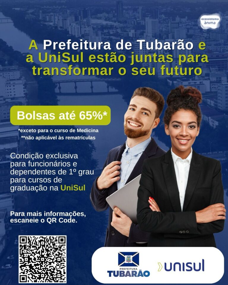 A Prefeitura de Tubarão, em parceria com a UniSul, está oferecendo bolsas de estudo para servidores públicos municipais e seus dependentes de primeiro grau, com descontos de até 65%.