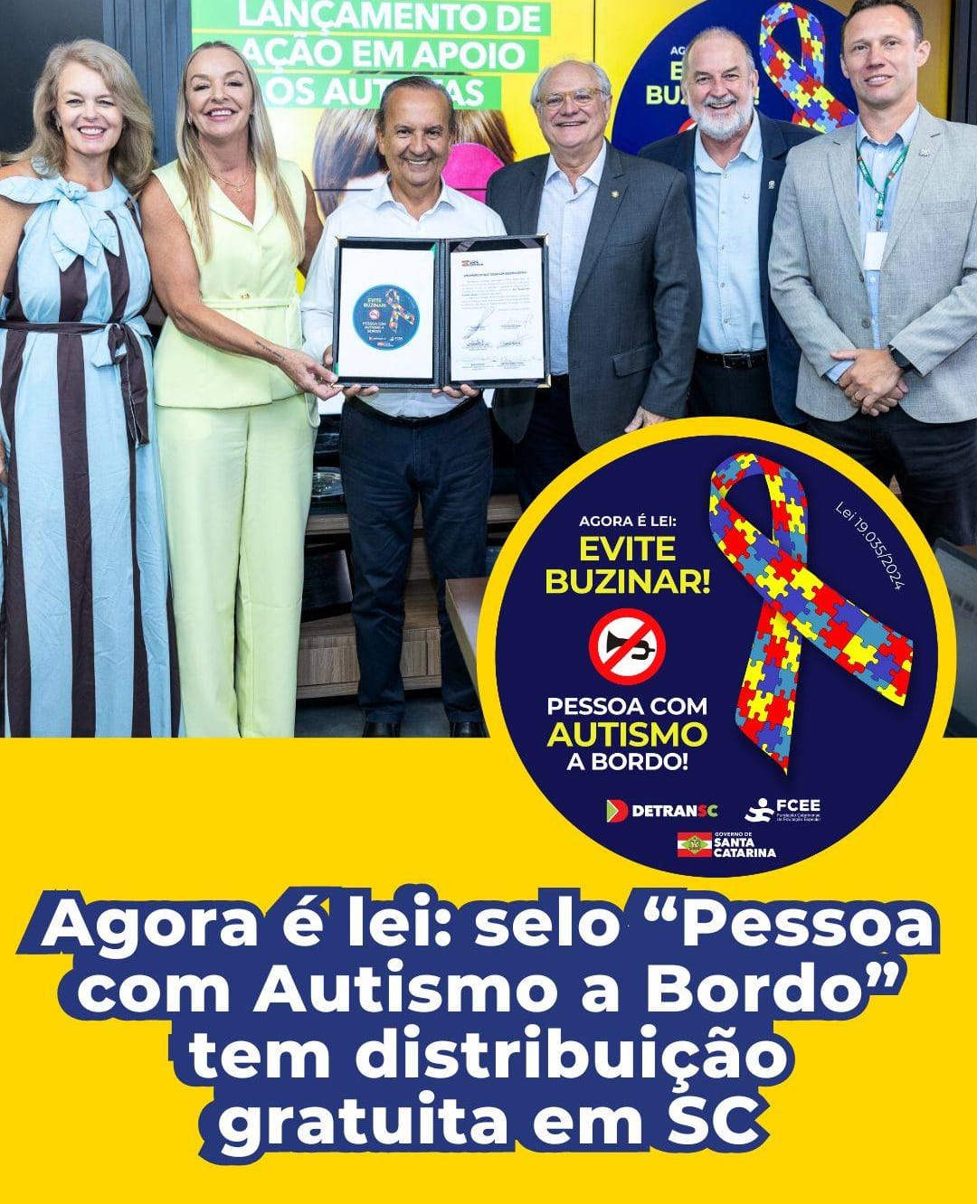 O Governo do Estado de Santa Catarina deu um passo importante para a inclusão e segurança viária nesta segunda-feira (2). Agora, por força de lei, o selo “Pessoa com Autismo a Bordo” passa a ser distribuído gratuitamente em todo o território catarinense. A iniciativa é uma parceria entre o gabinete do governador Jorginho Mello, a Fundação Catarinense de Educação Especial (FCEE) e o DETRAN-SC.
