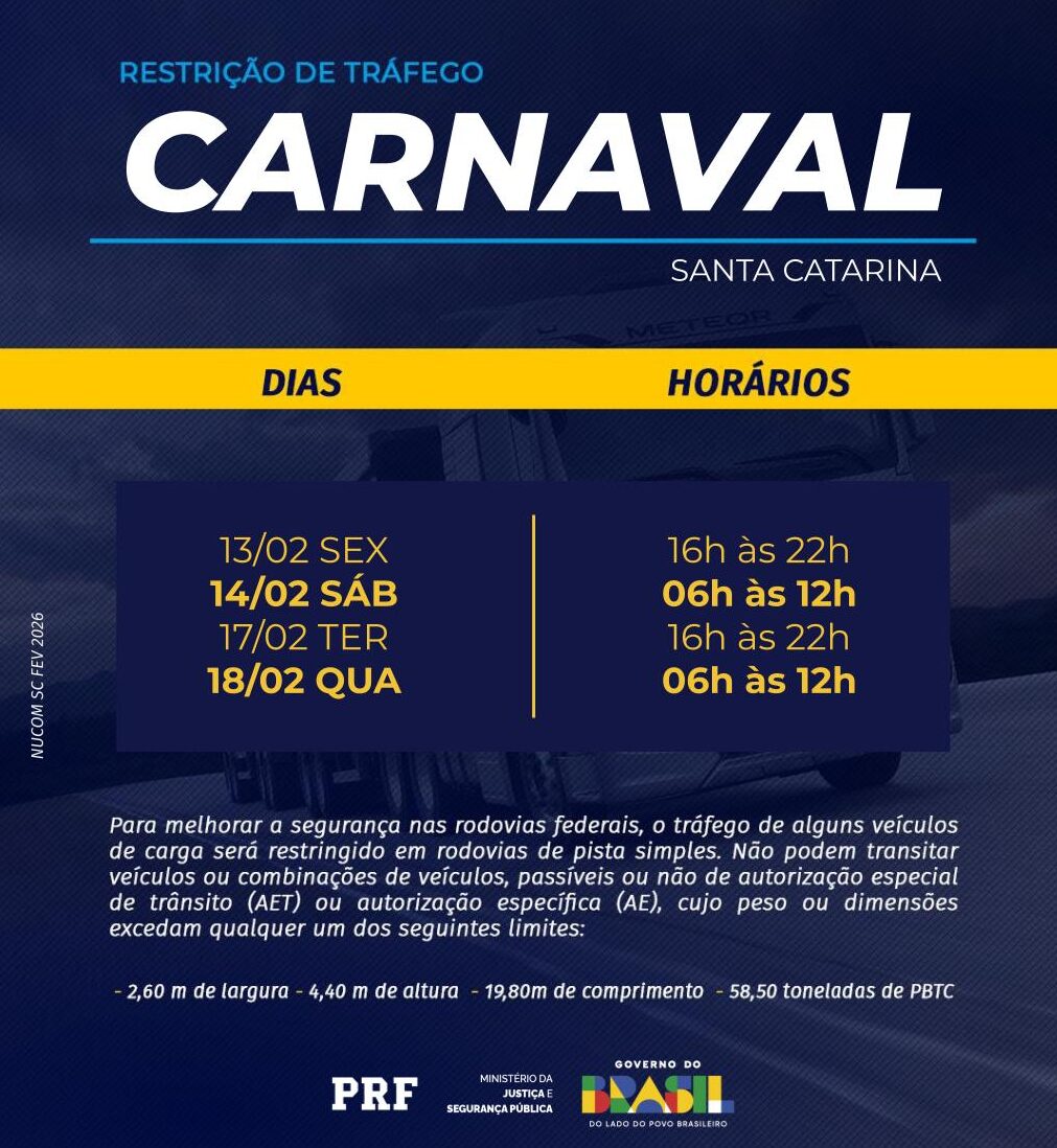 A partir da meia-noite de amanhã de sexta-feira (13), a Polícia Rodoviária Federal (PRF) inicia uma mobilização com alcance histórico em Santa Catarina para garantir a segurança nas BRs durante o Carnaval. O plano de ação conta com um reforço de mais de 300 policiais lotados em diversas regiões do Brasil, que já se encontram em Florianópolis e participam de curso na universidade corporativa da instituição.