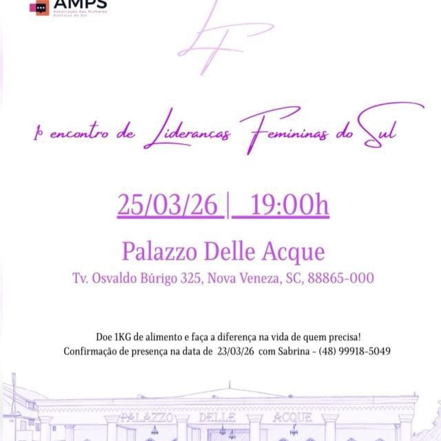 Nesta quarta-feira (25), às 19h:00, o município de Nova Veneza será palco do 1º Encontro de Lideranças Femininas do Sul, que acontecerá no Palazzo Delle Acque, localizado na Travessa Osvaldo Búrigo, 325.