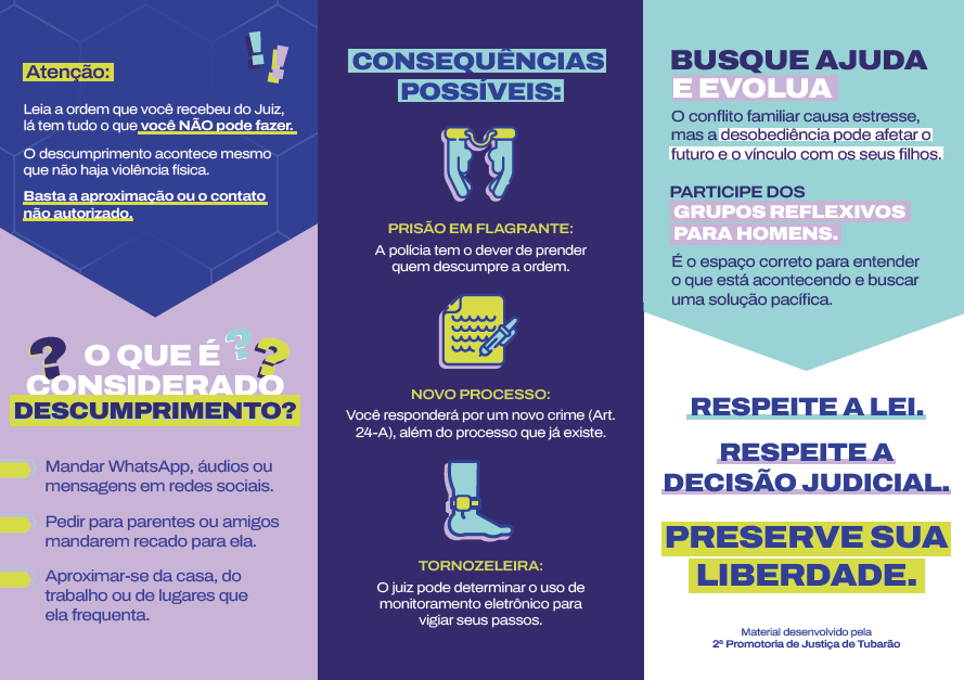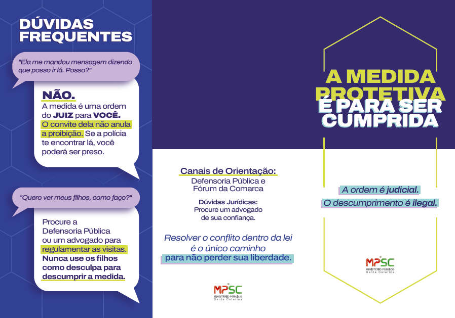 Com linguagem direta e acessível, ambos reforçam que o cumprimento da medida protetiva é essencial não apenas para evitar sanções legais, mas também para preservar direitos, garantir a segurança da vítima e possibilitar a construção de caminhos legais e responsáveis para a resolução de conflitos.